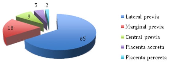 Despite being primiparous, 71 patients developed the same abnormalities of placentation as patients having risk factors.Overall, from 92 patients with placenta previa, 65 had lateral disposition, 18 marginal, and 9 placenta central situation. Seven patients developed MAP, with 5 accreta, and 2 percreta variations (Figure 2).
