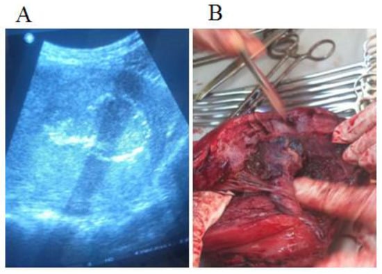 The hysterectomy piece for placenta accreta (A); The ultrasound before the intervention (B).