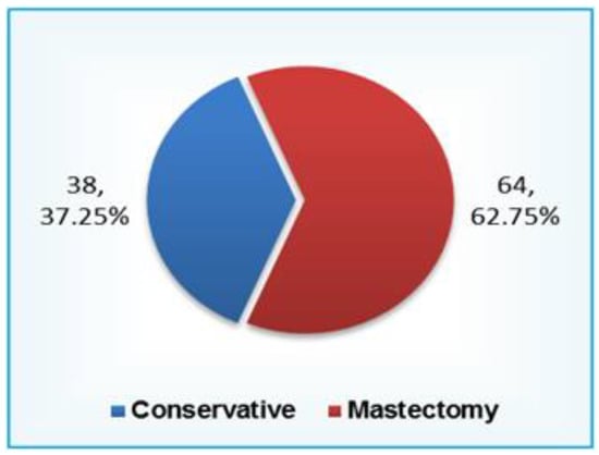 Breast surgical procedures were divided into two classes: mastectomies and conservative procedures. Conservative surgery included all procedures that partially spared the breast, such as sectorectomy, quadranectomy, or atypical oncoplastic resections. Mastectomies included variations that preserve the skin or the nipple-areolar complex (skin sparing, nipple sparing), but with total excision of the mammary gland.