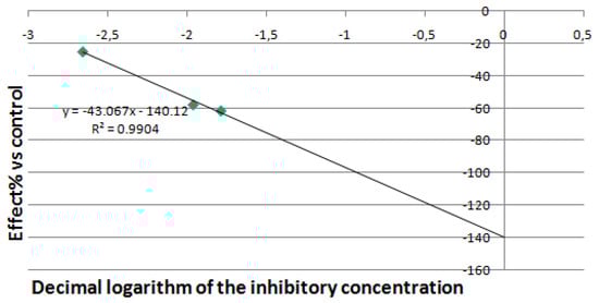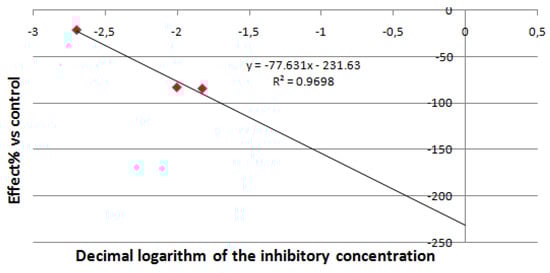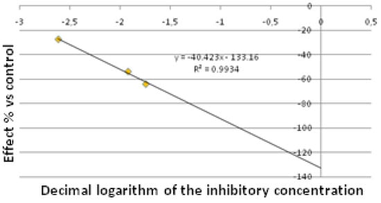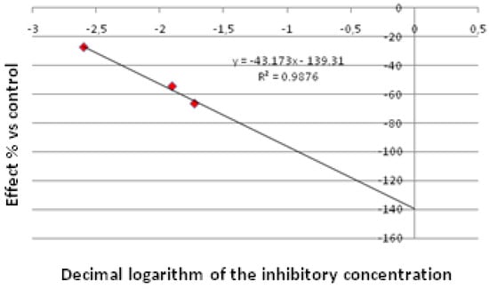 The validation of the Triticum method as a reliable alternative to the classic in vivo toxicity tests was accomplished by applying the technique to the compounds of the series A (A1-A8). The regression curve for compound A2 is shown in Figure 5.