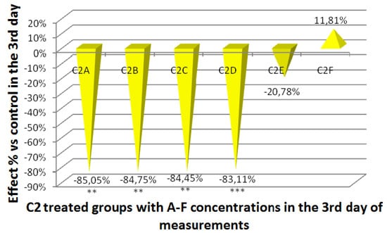 The calculated value of this innovative parameter is consistent with a low level of toxicity, confirmed by the vivo tests on mice. The statistical significance of radicular elongation variations for the groups treated with different concentrations of compound C2 in the 3rd day of measurements is shown in Table 2.