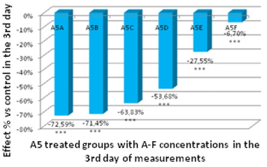 Evolution of radicular elongation versus control, under the influence of compound A5 in various concentrations (A – the highest, F – the lowest).