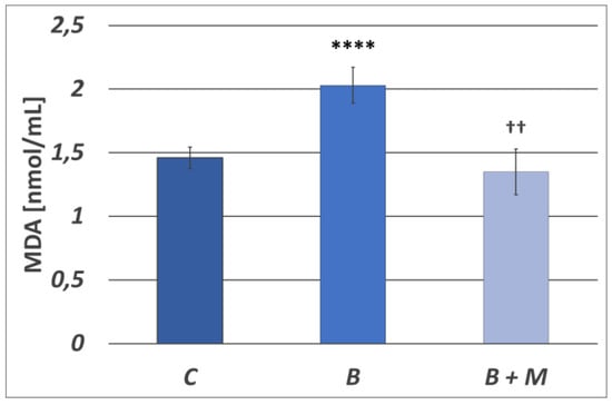 Effect of melatonin on MDA levels in plasma after burns. (C) control group; (B) burned, non – treated group; (B+M) burned, treated with melatonin group. Results are given as the mean ± SEM. ****р<0.0001 vs. control group; ††р<0.01 vs. burned, non - treated group.