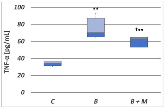 Effect of melatonin on TNF-α levels in plasma after burns. (C) control group; (B) burned, non - treated group; (B+M) burned, treated with melatonin group. Results are given as box plot, with median, 25th- and 75th-percentile values, min and max values. **р<0.01 vs. control group; †р<0.05 vs. burned, non - treated group; ••р <0.01 vs. control group.