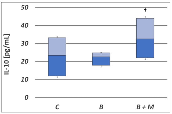 Effect of melatonin on IL-10 levels in plasma after burns. (C) control group; (B) burned, non – treated group; (B+M) burned, treated with melatonin group. Results are given as box plot, with median, 25th- and 75th-percentile values, min and max values. †p<0.05 vs. burned, non - treated group.