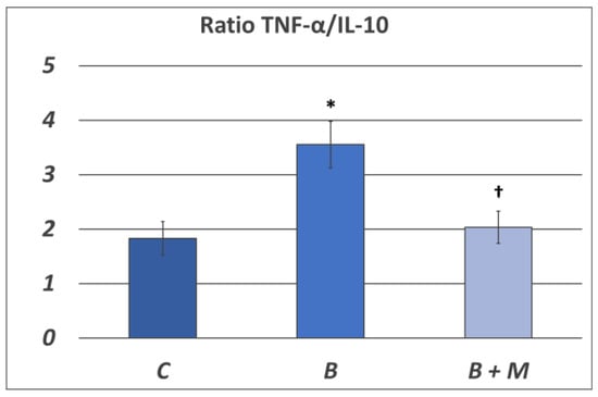 Effect of melatonin on TNF-α/IL-10 ratio in plasma after burns. (C) control group; (B) burned, non - treated group; (B+M) burned, treated with melatonin group. Results are given as the mean ± SEM. *р<0.05 vs. control group; †p<0.05 vs. burned, non - treated group.