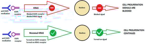 The objective of personalized cancer therapy is to uncover a cancer’s particular genes and proteins that permit the cancer cells to multiply, expand, and withstand aggressive therapy [36]. KRAS and NRAS gene alterations are currently accepted as biomarkers that foretell resistance to anti-epidermal growth factor receptor (anti-EGFR) [37] (Figure 3). In a recent study organized by Spindler et al. [38] that included 105 patients previously diagnosed with methastatic colorectal cancer (mCRC) indicated that KRAS mutations occured in 38% of patients that initially reacted to anti-EGFR treatment therapy medication.