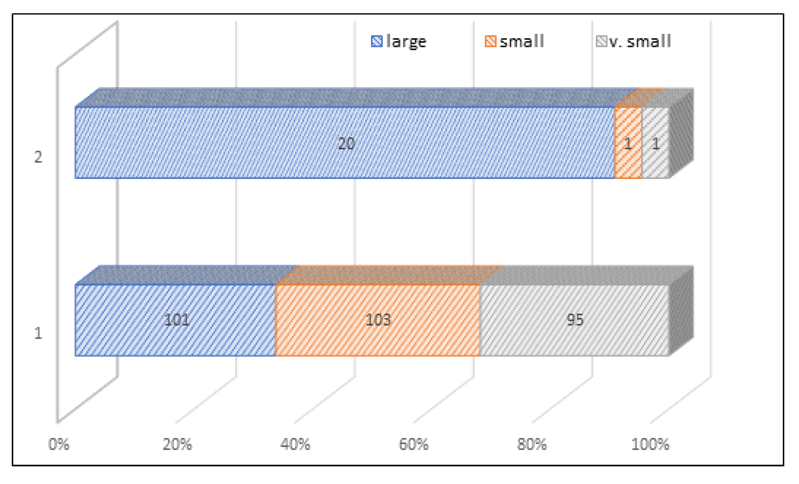 Distribution of polyps in relation to the size of the polyps and their degree of dysplasia. Legend: 1= low, 2= high.