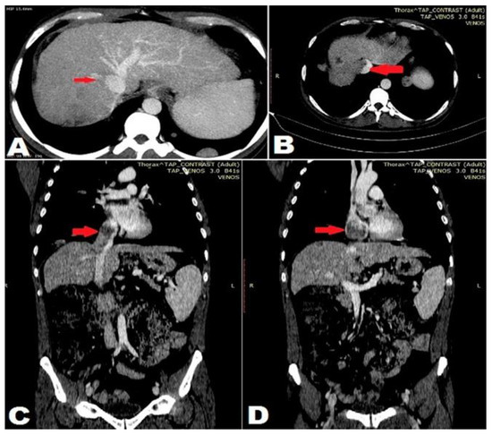 - Luo, X.; Zhang, B.; Dong, S.; Zhang, B.; Chen, X. Hepatocellular carcinoma with tumor thrombus occupying the right atrium and portal vein. A case report and literature review. Medicine. 2015, 94, e1049. [Google Scholar] [CrossRef] [PubMed]