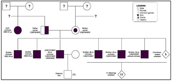 - Beutler, E.; Gelbart, T.; West, C.; Lee, P.; Adams, M.; Blackstone, R.; Pockros, P.; Kosty, M.; Venditti, C.P.; Phatak, P.D.; Seese, N.K.; Chorney, K.A.; Ten Elshof, A.E.; Gerhard, G.S.; Chorney, M. Mutation analysis in hereditary hemochromatosis. Blood Cells Mol Dis. 1996, 22, 187–94. [Google Scholar] [CrossRef] [PubMed]