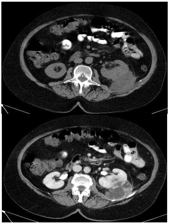 We conducted a retrospective observational study from January 2013 to December 2017 that identified 29 patients diagnosed with XGP histologically confirmed who have been treated in our clinic [9]. Moreover, patients with Xanthogranulomatous pyelonephritis associated with renal carcinoma have also been included. All patients were evaluated through a complete anamnestic and a rigorous physical exam. Preoperative management included routine blood tests and biochemical urine tests, summary and urinalysis [10]. Also, all patients underwent renal ultrasound, intravenous urography and computerized tomography—Figure 1. Patients with low excretory functions at the intravenous urography underwent renal scintigraphy with Tc99m-DTPA to confirm the non-functioning kidney and to evaluate the function of the other kidney. Any urinary tract infection was treated with antibiotics before the surgical intervention, or depending on the severity of the case, the patients underwent percutaneous nephrostomy or Cook stent (double JJ stent) insertion.