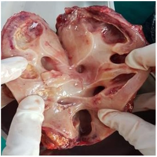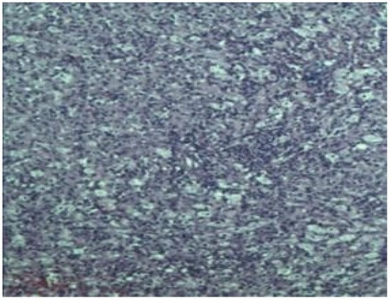 The examination of the excisional specimen (post- nephrectomy) revealed the presence of Xanthogranulomatous pyelonephritis, with characteristic chronic inflammatory infiltration and lipid-laden macrophages in all 29 cases—Figure 6. This is in conformity with the results of the research conducted by Arvind and co. [25,26]. The pathological examination revealed the presence of XGP in only 23 cases (79.31%), but it revealed the presence of the XGP simultaneous with renal carcinoma in six cases (20.68%).