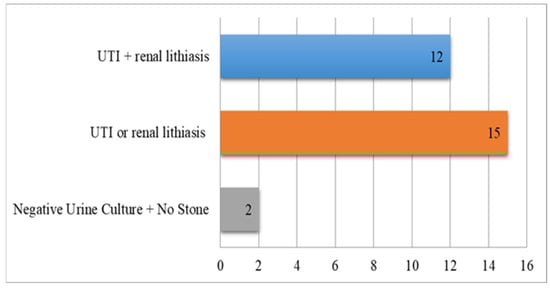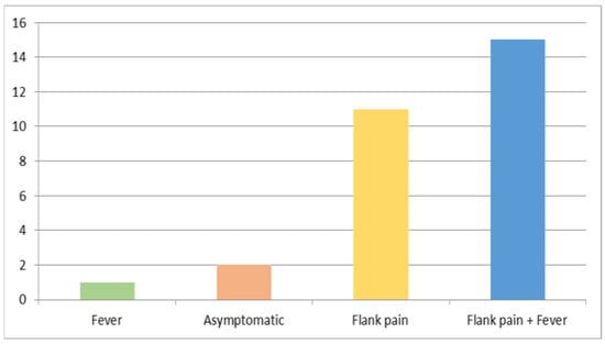 In the following chart, we noted that the main symptom for which patients were admitted to our hospital was a combination of fever and flank pain in 15 cases, flank pain in only 11 cases, two of them being asymptomatic and one presenting fever only—Figure 3.