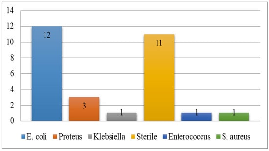 As shown in the following column chart—Figure 4, the most frequent microorganism identified was E. Coli, followed by Proteus, Klebiella, Enterococcus and Staphylococcus, while a significant number of patients had sterile urine.