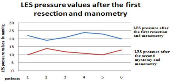 In the studied group, of the 8 patients who required surgery, the extensive resection of muscle fibers was performed in 6 cases following the visualization of the manometry results. Incomplete resection of the muscle fibers in the lower esophageal sphincter will lead to a recurrence of dysphagia that will eventually require surgical reintervention. A series of cases published by Clemente et al. demonstrated the persistence of high pressures at the level of the esogastric junction confirmed manometrically although, from the laparoscopic and endoscopic point of view, the intervention was considered a success [10].
