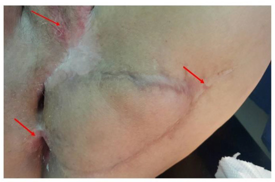 Closeup overview of multiple erythematous lesions located in mons veneris, in the flap and in the peri-anal region (red arrows).