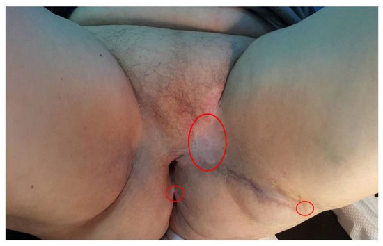 General overview showing multiple erythematous lesions located in mons veneris, in the flap and in the peri-anal region (red circles).