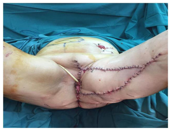 We performed punch biopsies for each suspicious lesion, and the histological examination confirmed the VPD recurrence. She underwent a large excision and coverage by a V-Y flap of the inner thigh (Figure 3 and Figure 4).