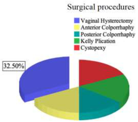 In Figure 1, distribution of surgical procedures is presented. The most frequent procedure (32.50%) was vaginal hysterectomy. Anterior and posterior colporraphy, associated with Kelly approach showed equal percentages (17.50%), followed by direct cystopexy (15%).