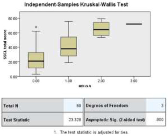 Table 1 provides further support for the findings presented in Figure 1 and an explanation of the summary statistics of the participants’ (N = 80) scores on the SSCL and the BDI item 9. The latter scores that ranged from 0 to 3 were compared to the SSCL total and sub-category scores (physical, psychological and behavioral stress-related symptoms), indicating significant differences and that over one third (31; 38.8%) of the participants were so highly stressed that they felt suicidal.