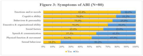 Figure 3 shows the percentage of the research participants who rated a particular neuropsychological deficit in the patient with ABI as causing them profound stress. Most caregivers felt that deficits involving emotions and/or moods (83.3%), cognitive ability (78.8%), behavior and personality (75.0%), executive and organizational ability (70.0%), and social factors (65.0%) caused them profound stress. Less than 60% of the participants felt that the patient’s deficits in speech and communication, physical function and movement, and sexual behavior caused them stress. Comparatively, the results show that a large percentage of the research participants were experiencing profound stress as a result of having to cope with the neuropsychological deficits in their relative with ABI.