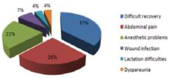 Researching the reasons of those who recommended natural birth, those 20 women listed a number of disadvantages of Caesarean sections: 10 (50%) stated that recovery was more difficult, 7 (35%) stated that they had significant and prolonged abdominal pain, 6 (30%) woman had anesthesia-related problems, involving spinal anesthesia in 5 cases (technical difficulties—multiple punctures, partial anesthesia, persistent headache post-anesthesia, hypotension post-anesthesia) and general anesthesia in one case (the sensitive perception was not abolished and even led to a mental shock). The other problems mentioned were: wound infection in 2 cases, difficulties with breastfeeding, dyspareunia (Figure 2).