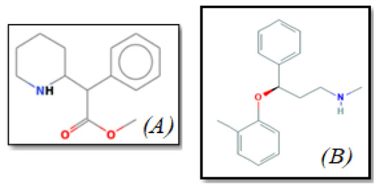 The chemical structure of (A) Methylphenidate and (B) Atomoxetine.