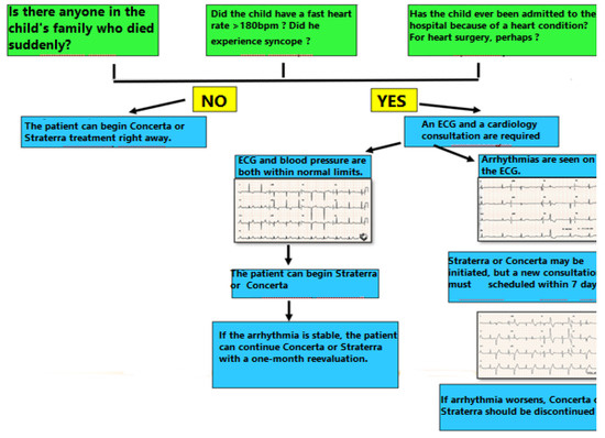 If during Anamnesis, the psychiatrist receives any positive answer (YES) to any of the 3 questions, a cardiac consultation should be taken into account. This includes a clinical examination, an ECG and blood pressure measurement. During the physical examination, the cardiologist searches for signs of heart failure: edema, hepatomegaly, jugular distension, which may be signs of underlying heart disease. The presence of a heart murmur "per se" does not contraindicate the administration of Atomoxetine or Methylphenidate, but the cardiologist should differentiate between “physiological murmur” and the murmur caused by an underlying heart disease. A blood pressure level over 120/70 mmHg before the onset of the treatment involves regular measurement of the blood pressure during the treatment, at 1 week initially, then at 1-month follow-up. If the ECG examination does not reveal arrhythmias or prolonged QT interval, the treatment with Methylphenidate or Atomoxetine may be initiated. If arrhythmias are present on the initial ECG, treatment can be started, but it requires reassessment after 1 week and 1 month.