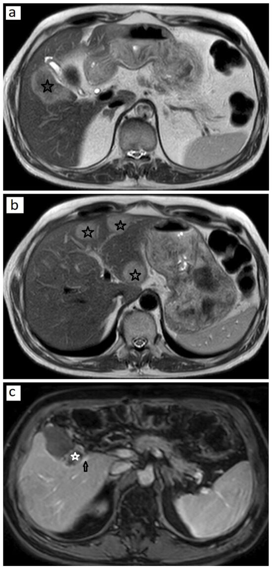 Local tumor progression in a 65-year-old patient with colon cancer. (a) T2-weighed image shows a hyperintense metastasis with a diameter of 3 cm in segment V near the gallbladder bed and portal vein branch, which was treated with microwave ablation therapy. (b) Three metastases in the left lobe (black asterisks), which were resected via lobectomy, are seen on T2-weighed image. (c) At 1-year follow-up, a local tumor progression (white asterisk) adjacent to a portal vein branch (arrow) is encountered on postcontrast T1-weighed image.