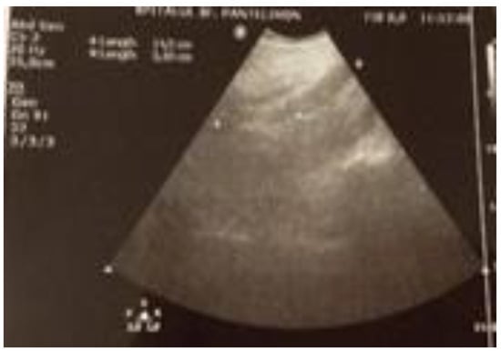 The laboratory test results reveal leukocytosis levels of 21,300/µl and a C-reactive protein level of 293 mg/ l. The abdominal ultrasound reveals a non-homogeneous collection of (14.5/3 cm), located anteriorly to the left psoas muscle (Figure 5).