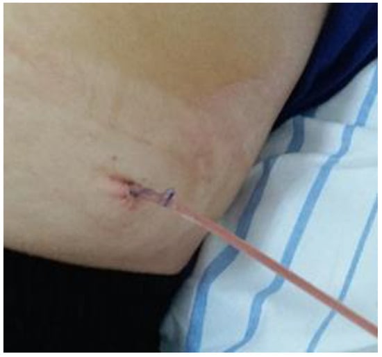 Under ultrasound guidance, a 12 Fr tube is inserted into the cavity of the collection and the fetid pus is evacuated. The tube is maintained until the drainage becomes serous, and the ultrasound check confirms the disappearance of the retroperitoneal collection (Figure 7 and Figure 8).