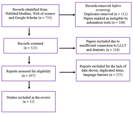 A number of 733 papers from PubMed/Medline, Web of Science and Google Scholar were included for the preparation of this study. The key words used were: “Bone regeneration”, “Laser therapy”, “Photobiomodulation” or “bio-stimulation”, “Low-level Laser therapy” OR “LLLT”, “Osteoblast proliferation” AND “differentiation”. For this research, we have also used the Boolean operator (AND, OR, NOT). The selected papers are both in vitro and in vivo studies. After having read the abstracts, 307 papers were chosen for peer review, out of which 255 papers were excluded from this study for several reasons, including the lack of data shown, duplicated items, language barriers. Therefore, 52 papers were included in the final research (Figure 1).