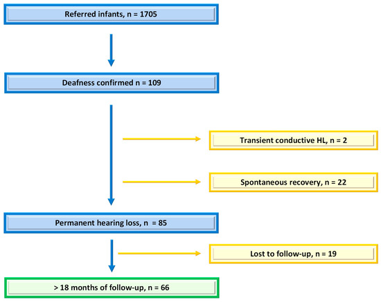 - Verstappen, G.; Foulon, I.; Van den Houte, K.; Heuninck, E.; Van Overmeire, B.; Gordts, F.; Topsakal, V. Analysis of congenital hearing loss after neonatal hearing screening. Front. Pediatr. 2023, 11, 1153123. [Google Scholar] [CrossRef] [PubMed]