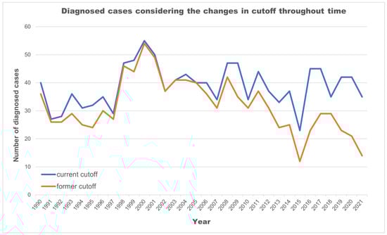 Number of cases further diagnosed given the cutoff updates (1981–2021).