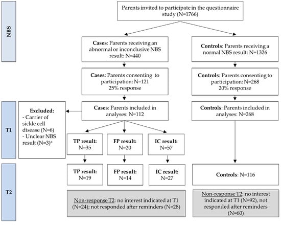 Flowchart of the study. Parents with an inconclusive result were invited for a second heel prick, which gave a normal result. T1 was sent 5 weeks after the NBS result and T2 was sent 4 months after the NBS result. NBS Newborn bloodspot screening; TP true-positive; FP false-positive; IC inconclusive. a In case the NBS result could not be derived from the questionnaire, the response was excluded from analyses.