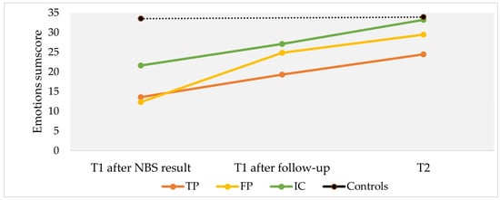 Emotions regarding the test result were assessed using mean sum scores of parents’ retrospectively reported emotions at three different moments in time (Figure 2). Participants with TP (mean sum score = 13.6, SD = 4.9), FP (mean = 12.3, SD = 3.9) and IC (mean = 21.8, SD = 9.4) reported more negative emotions after receiving the initial NBS result or the request of a second heel prick compared to controls (mean = 33.5, SD = 2.3) (all p < 0.001). After receiving definitive NBS results (reported at T1), all cases reported fewer negative emotions. At T2, TP (mean = 24.4, SD = 4.9) and FP (mean = 29.5, SD = 8.6) participants experienced more negative emotions compared to controls (mean sum score = 33.9, SD = 1.6; both p < 0.001).