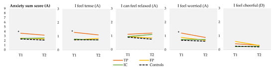 Concerning parent-reported child’s health status (tested with ANOVA), no significant differences were observed between TP (mean = 14.1, SD = 2.7), FP (mean = 13.8, SD = 1.9), and IC (mean = 14.0, SD = 2.7) participants compared to controls (mean = 13.8, SD = 2.3) at T1. At T2, TP (mean = 14.0, SD = 2.4), FP (mean = 13.3, SD = 2.7) and IC (mean = 14.4, SD = 2.6) participants again showed similar responses compared to controls (mean = 14.0, SD = 2.4). No significant differences were found.