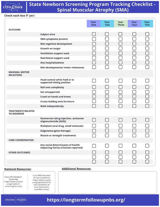 SMA was chosen as the use case because it is recommended that treatment of newborns diagnosed with SMA occurs within the first weeks of life, and this timeline of early intervention requires close collaboration between neuromuscular providers, e.g., pediatric neurologists or physiatrist, and state NBS programs [1,4]. The recommended NBS screen detects the common deletion in the survival motor neuron 1 (SMN1) gene [5]. The treatment and clinical management of SMA requires additional laboratory-based testing to confirm the deletion in the SMN1 gene and determine the SMN2 copy number [5]. SMN2 is a partially functional copy of SMN1 determining the severity of the disease [5]. The SMN2 copy number is not part of the RUSP recommendation, and most state NBS programs do not routinely include SMN2 copy number in screening [5]. Increasingly, follow-up staff of state NBS programs help to coordinate this testing as a second-tier test [5]. While NBS for SMA coupled with the new therapies represents a significant breakthrough, clinicians and state NBS programs are facing new challenges. Among these challenges are determining the optimal timing for early intervention and selecting appropriate treatment options, including the consideration of combination therapies [5]. This LTFU program presents a promising model to address these challenges.