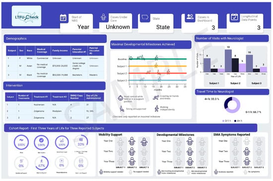 Results from the LTFU-Cares Dashboard showcase case-level data tailored to pediatric neurologists (Figure 3) and state-level data for the respective states (Figure 4). Each dashboard is customized based on the data collected from LTFU-Cares. The design of the dashboard was shaped by collaborative consultations with clinicians who provided input on the information they wanted featured in the dashboards. All clinicians (100%) emphasized the importance of including maximal motor milestones achieved over time, a feature tailored to help them assess if cases were on target, as shown in the middle of Figure 3. Additionally, clinicians expressed a need to include detailed information on the timing of treatment from the NBS result on state dashboards, which is shown on the right of Figure 4. Key information, including demographics, newborn screening results, and cohort reports, were included in both dashboards.