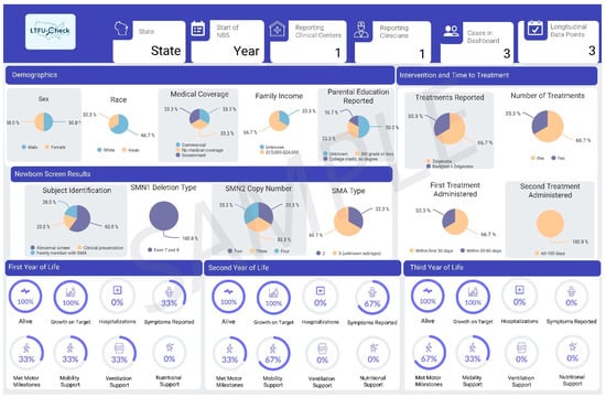 Venngage was used to present data visualization models showcasing de-identified case-level data for clinicians and aggregate annual state-level data for state NBS programs. Both dashboards included breakdowns of demographic information, newborn screening results, health outcomes compared to a baseline [32,33], interventions, and care coordination based on the data collected. Data presented in this dashboard were only shared with the reporting clinical site and its respective state NBS program.