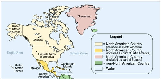 Map showing countries considered to be in North America. (Note: This portion of the report only addresses the United States and Canada).