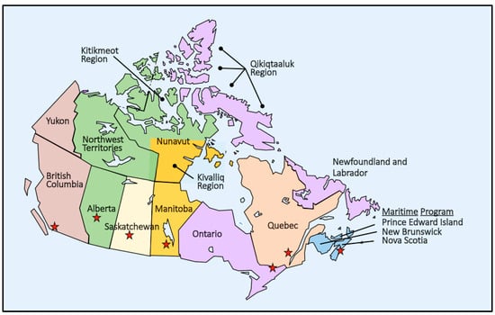 Map showing Canadian provinces and territories. Jurisdictions of the same color utilize the same screening laboratory (laboratory location indicated by a star).