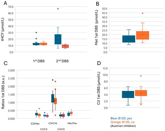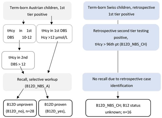 Neonates identified by the Austrian NBS are obligatorily recalled to investigate them for inborn errors of B12 metabolism, organic acidurias, and B12D. For selective diagnostics, urine and dried blood spots (DBS) are collected, and venous blood samples are taken to measure ammonia, blood gases, organic acids, B12, methylmalonic acid (MMA), total Hcy (tHcy), Met, and holo-TC [].