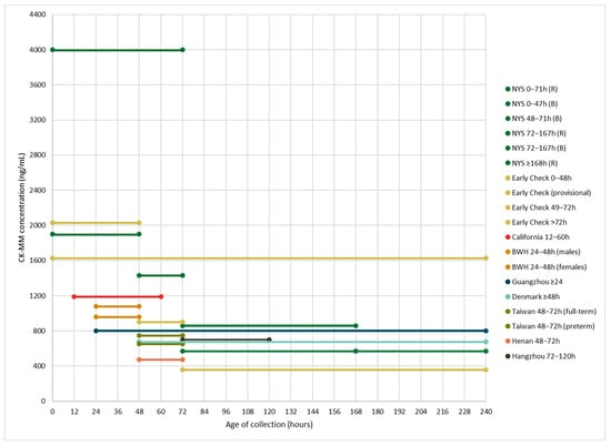 Multiple NBS pilot studies have reported various age-related CK-MM cutoffs. Some of these studies have also determined sex, birthweight (BW), and gestational term-related (i.e., preterm vs. full-term) cutoffs (Table 1 and Figure 1). The New York State (NYS) NBS and RTI International’s Early Check NBS voluntary research programs have both implemented cutoffs for CK-MM that decrease as the age at sample collection increases [12,16,17,20,21]. NYS set both borderline and referral cutoffs; new specimens were requested for any borderline samples. Early Check also established cutoffs based on BW given that BW and gestational age are positively correlated with CK-MM levels [16,17,20,22]. Additionally, National Taiwan University Hospital implemented separate cutoffs for full-term (750 ng/mL) versus preterm (650 ng/mL) newborns [10], whereas the supplemental DMD NBS program at Brigham and Women’s Hospital, which only included full-term newborns, had separate cutoffs for males (1080 ng/mL) and females (958 ng/mL) [19]. Two studies in China only included males [13,14], and multiple studies have found that CK-MM levels are slightly higher in males compared to females [16,17,27]. However, despite the X-linked nature of DMD, female carriers can be symptomatic, and given recent improvements in testing and interventions, implementing NBS for DMD for both males and females is beneficial [28]. Additionally, with the exception of Parad et al. (2021), who relied on the previously established cutoffs for males and females (Revvity), other recent studies have implemented cutoffs between the 99th and 99.985th percentiles based on study-specific population distributions [19]. Generally, past studies have demonstrated that in unaffected newborns, CK-MM levels are, on average, higher at birth and decrease (i.e., stabilize) at approximately 1 week of life or sooner [17,20].
