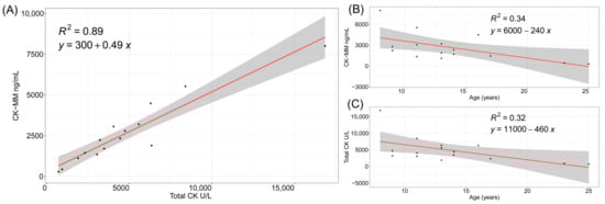 Total CK and CK-MM levels were elevated in childhood and into teenage years in the 15 patients with DMD (Figure 2). Total CK and CK-MM levels were strongly correlated (R2 = 0.89). Both total CK and CK-MM levels were negatively correlated with age, presumably because of severe muscle loss [31,32].