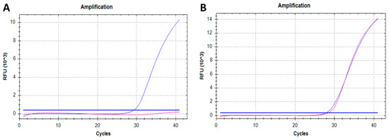 First-tier test (qPCR) results for SMA NBS: amplification curves for (A) positive SMA screening and (B) negative SMA screening. The pink curves represent the fluorescent signal of FAM fluorophore (SMN1), whereas the blue curves represent the fluorescent signal of HEX fluorophore (endogenous control RPP30).