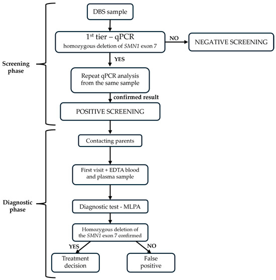 Medical staff of all maternity hospitals in Croatia were informed about the expansion of NBS and the importance of proper DBS sampling, such as avoiding all potential sources of contamination and qPCR reaction inhibitors (blood dripping from a container with anticoagulant EDTA and heparin) [18,19]. Public information about NBS, available at the official website of the University Hospital Center Zagreb, was updated [20]. Lastly, the SMA NBS workflow was established and adapted to the existing working conditions in the laboratory (Figure 3).