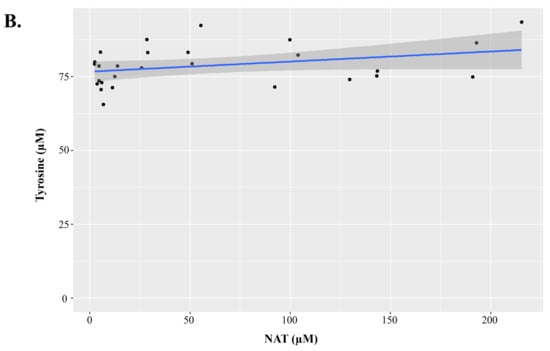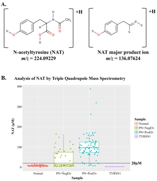 We acknowledge that NAT’s rapid urinary excretion limits its utility, making it detectable in blood only during PN administration and for a few hours after PN is discontinued, and overall, there is limited information regarding NAT as a metabolite in humans. While we state NAT is not an endogenous metabolite in the blood, it is important to note NAT has been found in the urine of TYRSN1, tyrosyluria [20,21], and tyrosinosis [39]. Therefore, we acknowledge that NAT is produced in humans through a mechanism historically associated with clearing excess Tyr. More recently, in 2020, NAT was demonstrated in stressed animal models to function as an intrinsic factor of mitohormesis [40]. Also, this study reported NAT detection in what appeared to be 80 µL pooled adult human serum [40], and a comparison of their spectral results, the pure NAT standard (Figure S1C), and the spectral results from our PN+ specimens (Figure S1B) are all in agreement. We acknowledge it is possible NAT could be a low-abundant circulating metabolite in adults that we were not able to detect in 3.1 µL of whole blood on DBSs collected from neonates shortly after birth. It is also important to note that NAT is sold as a nutritional supplement, similar to N-acetylcysteine. Therefore, while very unlikely in our opinion, it may be possible that a mother consuming an NAT dietary supplement shortly before giving birth or while breastfeeding could result in NAT elevations in their newborn’s DBS; however, we found no data in the literature to support this.