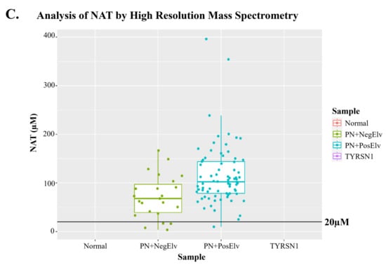The presence of NAT in all residual NBS specimens was unusual given that NAT is not reported as an endogenous blood-based metabolite; therefore, we suspected an interference in the m/z 224.1 > 136.1 NAT transition in the triple quadrupole platforms. The residual NBS specimens were re-analyzed by FIA coupled to high-resolution mass spectrometry (HRMS) using parallel reaction monitoring, and we determined an m/z of 136.0870 present in the NAT m/z 224.1 > 136.1 transition integrated in the triple quadrupole platforms (Figure S1A,B). Figure 1C clearly displays NAT was only present in PN+ specimens when analyzed by HRMS (i.e., 74 of 80 PN+PosElv specimens, 92.5%), and six of the seven PN+PosElv specimens that had NAT < 20 µM (Figure 1B) did not have any detectable NAT present in the blood (Figure 1C). We hypothesized that these six PN+PosElv neonates had been taken off PN [26] and/or transitioned to enteral feeding, and their DBS cards were still annotated as PN+; thus, there was sufficient time for NAT urinary excretion prior to their DBS collection. It is important to note NAT was found in the urine of tyrosinemia type 1 (TYRSN1, OMIM 276700), so we included a TYRSN1 (n = 1) confirmed case and, as expected, found NAT was not detectable in their DBS.