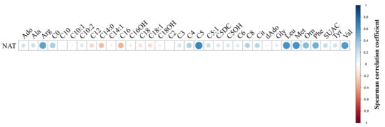 Next, concentrations of biomarkers in the PN+ specimens were correlated using Spearman correlations, and a bubble correlogram of Spearman coefficients was generated. The full bubble correlogram is presented in Figure S2. Figure 2 displays that NAT was highly correlated with arginine (Arg), leucine (Leu), Met, Phe, and valine (Val). This was expected since NAT is present in PN solutions with these amino acids, so an increase in NAT should result in a concomitant increase in amino acids. Isovalerylcarnitine (C5) was positively correlated with NAT, which is not present in PN solutions; however, it is well-known that C5 is elevated in PN+ neonates as a metabolic byproduct [29].